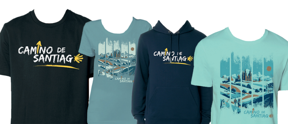 Y para los más clásicos, hay opciones de lettering del Camino de Santiago con elementos canónicos del Camino, como la flecha o la concha, tanto en camiseta como en sudadera.